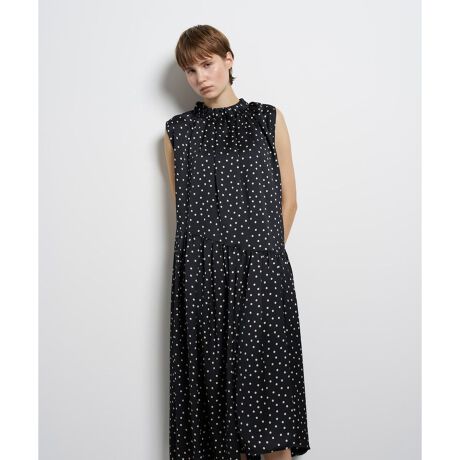 手書き風のランダムなドット柄を、ハンマーサテン生地にプリント。水面のようにゆらめく凹凸感が、サテンの光沢を上品に抑えている。快適な着心地を叶える程良い肉感とナチュラルストレッチ。