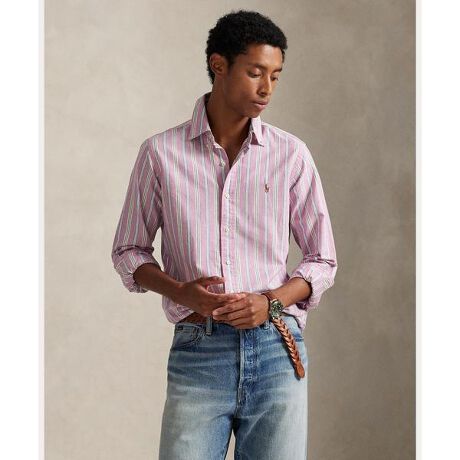 Ralph Laurenの初期のデザインに登場して以来、Poloルックの重要な柱としての地位を築いてきたオックスフォードシャツ。現在もラルフ・ローレンが無数のバリエーションを生み出しているアイコニックなシャツ。マルチカラーのシグネチャーのポニー刺繍をあしらったストライプバージョン・クラシックフィット:胸、ウエスト、袖にかけてゆったりとしたカット、低いアームホール・ボタンダウンカラー / ボタン付き前立て・長袖、ボタン付きバレルカフス / 快適なフィットと動きやすさを実現する、ボックスプリーツが入ったスプリットバックヨーク・左胸にマルチカラーのシグネチャーのポニー刺繍・モデル身長185cm、着用サイズM※注意:柄の配置は、商品によって異なります。※ラルフ ローレンのシャツは、袖口がまくられた状態で納品され、そのままの状態で保管されている場合があります。デザインや商品特性を活かす為に、あえてこのような工夫をしておりますので、予めご了承ください。 【素材】・本体:綿 100% 装飾部分を除く【生産国】ベトナム