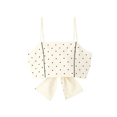 リボンで変化する、大人可愛い2WAYスタイル2WAY仕様で気分や着こなしに合わせて表情を変えられる一枚です。クラシックなドット柄と大きなリボンが上品な甘さを演出し、短めのビスチェ丈はハイウエストボトムと好相性でスタイルアップが期待できます。背面はシャーリングで伸縮性があり、調節可能な細ストラップでずれにくく安定した着心地です。シャツやワンピースの上から重ねればトレンド感のあるレイヤードが完成し、シンプルなトップスに合わせればアクセントに。普段使いからお出かけまで幅広く活躍するので、コーデの幅を手軽に広げたい方におすすめです。透け感[なし]