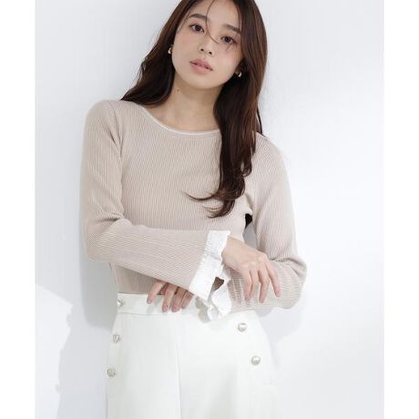 身頃はすっきりとしたリブ編みで、女性らしいフィット感と上品なラインを演出してくれるニット。袖口はフレアカフス仕様で、手元に軽やかな動きをプラスします。袖先には配色のレース編みをあしらい、華やかなアクセントに。襟ぐりにも配色ラインを入れることで、統一感のあるデザインポイントを付けています。<素材>身頃はリブ編みです。<詳細>仕様・開閉なし裏地・なし透け感・なし / 光沢・なし / 伸縮性・あり 生地の厚さ・普通※モデルの着用画像の場合、光の当たり具合により、実際の色味と異なって見えることがございます。色味は、商品単体の画像をご参照ください。