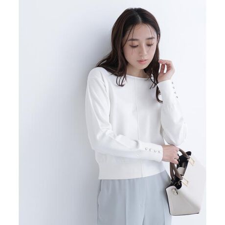フロントにピンタックラインを効かせたドルマンライクなシルエットのニットプルオーバー。襟はすっきりとしたボートネックデザインです。袖口に付けたライトゴールドカラー釦がきらっとアクセント。程よく短めの着丈感なのでアウトスタイルも様になるデザインです。マシンウォッシャブル可能なのでご自宅で扱いやすく、UVカット機能も備えた素材は、これからの季節に活躍してくれます。<素材>キレイな目面の糸を使用し、天竺編みで編み立てています。<詳細>仕様・開閉なし裏地・なし透け感・なし / 光沢・なし / 伸縮性・あり 生地の厚さ・普通※モデルの着用画像の場合、光の当たり具合により、実際の色味と異なって見えることがございます。色味は、商品単体の画像をご参照ください。