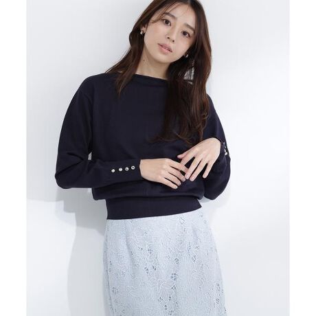 フロントにピンタックラインを効かせたドルマンライクなシルエットのニットプルオーバー。襟はすっきりとしたボートネックデザインです。袖口に付けたライトゴールドカラー釦がきらっとアクセント。程よく短めの着丈感なのでアウトスタイルも様になるデザインです。マシンウォッシャブル可能なのでご自宅で扱いやすく、UVカット機能も備えた素材は、これからの季節に活躍してくれます。<素材>キレイな目面の糸を使用し、天竺編みで編み立てています。<詳細>仕様・開閉なし裏地・なし透け感・なし / 光沢・なし / 伸縮性・あり 生地の厚さ・普通※モデルの着用画像の場合、光の当たり具合により、実際の色味と異なって見えることがございます。色味は、商品単体の画像をご参照ください。