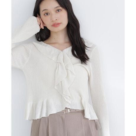 繊細なフリルトリムが程よい華やかさをプラスしてくれるカーディガン。ショート丈がウエスト位置を高く見せてくれるので、スタイルアップ効果も期待できます。スカートやワイドパンツなど様々なボトムスと相性よく着ていただけます。<素材>柔らかくラフな印象のある糸を使用しています。<詳細>仕様・前ボタン裏地・なし透け感・ややあり / 光沢・なし / 伸縮性・あり 生地の厚さ・普通※モデルの着用画像の場合、光の当たり具合により、実際の色味と異なって見えることがございます。色味は、商品単体の画像をご参照ください。