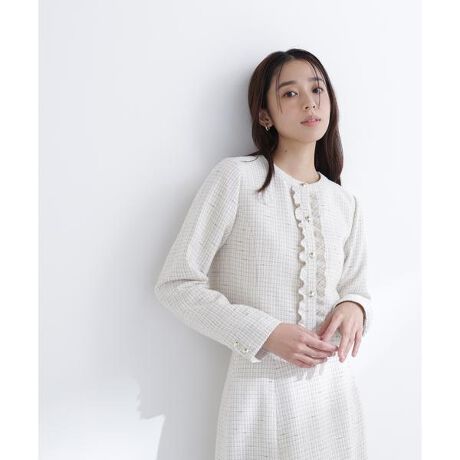 フロントの控えめなフリルが上品なアクセントのツイードジャケット。コンパクトな丈感なのでスタイルアップして見えます。品のあるゴールドカラー釦が引き立ち、華やかなオケージョンシーンにぴったり。同素材のスカートとのセットアップもおすすめです。さりげないラメ糸が織り込まれた品のある春ツイードを使用しています。<素材>NBBオリジナルのツイード素材を使用しています。<詳細>仕様・前ボタン裏地・あり透け感・なし / 光沢・なし / 伸縮性・なし 生地の厚さ・普通<シリーズ>■スカート[品番:0176120154]※モデルの着用画像の場合、光の当たり具合により、実際の色味と異なって見えることがございます。色味は、商品単体の画像をご参照ください。