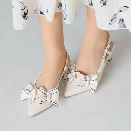 ・上品な素材と配色で目を引くリボンが足元を華やかに演出するスリングバックパンプス!
