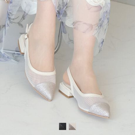 ・キラキラのグリッター×上品なチュールメッシュの異素材の切り替えデザインがポイントのスリングバックパンプス!