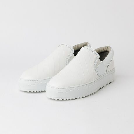 アッパーに格子柄の型押しを施し、ソールにはITALIAマルゴム社のシャークソールを採用したスリッポンスニーカー。ラバーソールとのコントラストが程よいカジュアル感と会的な印象を持ち合わせた一足は、休日のみならずセットアップや綺麗目コーデにもおすすめです。