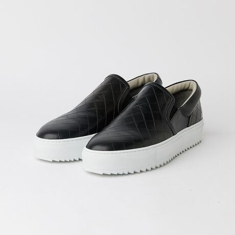 アッパーに格子柄の型押しを施し、ソールにはITALIAマルゴム社のシャークソールを採用したスリッポンスニーカー。ラバーソールとのコントラストが程よいカジュアル感と会的な印象を持ち合わせた一足は、休日のみならずセットアップや綺麗目コーデにもおすすめです。