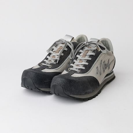 ヴィンテージのランニングシューズをデザインソースに、つま先の形状にも拘ったオリジナルラストを使用した一足。サイドにあしらわれたステッチワークはブランド名であるalfredoBANNISTERを“子供が落書きした!”想定でデザインに落とし込みました。配色や素材使い、仕上げのヴィンテージ加工など細部にまでこだわった古着ライクなオリジナリティ溢れる他に類のないデザイン。