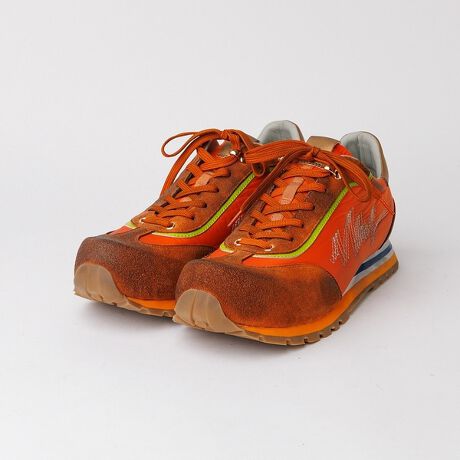 ヴィンテージのランニングシューズをデザインソースに、つま先の形状にも拘ったオリジナルラストを使用した一足。サイドにあしらわれたステッチワークはブランド名であるalfredoBANNISTERを“子供が落書きした!”想定でデザインに落とし込みました。配色や素材使い、仕上げのヴィンテージ加工など細部にまでこだわった古着ライクなオリジナリティ溢れる他に類のないデザイン。