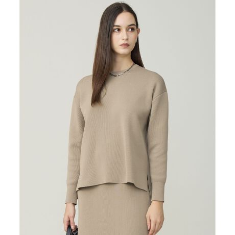 ■デザイン滑らかでスムージーな風合いと適度なハリ感が特徴のニットプルオーバーです。後ろ身頃のヨーク切り替え、前後差のある裾やサイドスリット、絶妙なサイジングなど細部の仕立てに拘っています。ふっくらと着心地抜群なスムース組織で編みたてており、一枚着はもちろん、寒い時期は襟付きブラウスやカットソーなどとのレイヤードスタイリングもおすすめです。また、同シリーズのスカートとセットアップで女性らしく洗練された着こなしも叶います。