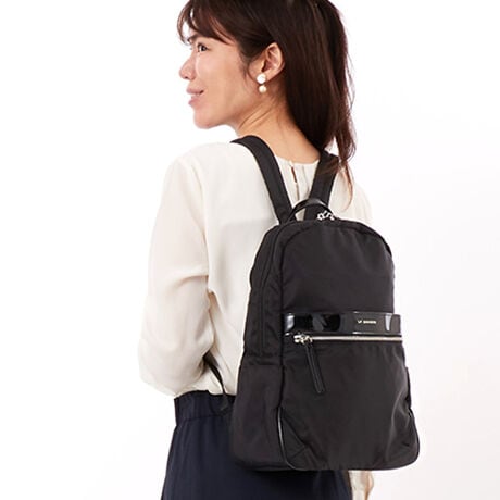 軽量なナイロンでアクセントにエナメルを使用した、おしゃれな大人カジュアルのリュックサック。