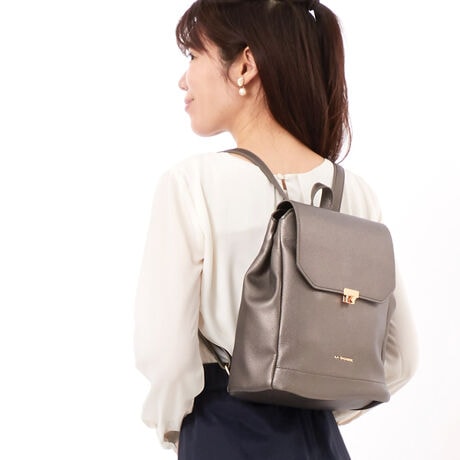 フロントの金具がアクセントとなっている、上品でエレガントな印象のリュック。