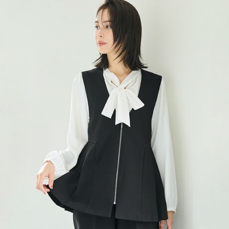ブラウスやカットソーの上に重ねるだけで、きれいめなスタイリングに。