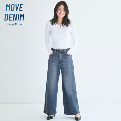 カジュアルにもきれいめにも使える、ムーヴデニムワイドパンツ