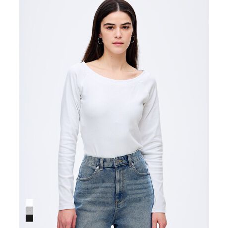 女性らしい抜け感を演出、ラグランオフショルダーロングTシャツ
