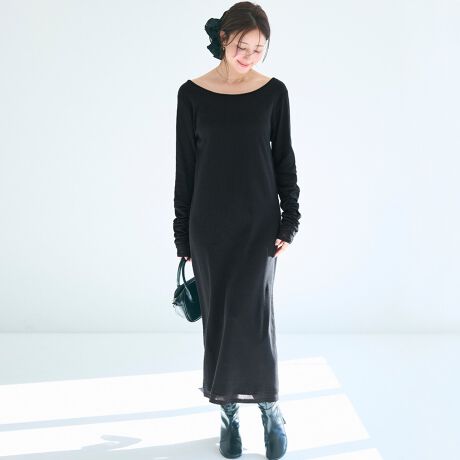 袖のシャーリングデザインが映える、レイヤードスタイルを想定したワンピース。