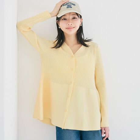 体型カバーと女性らしさを両立する、ウォッシャブルペプラムニットチュニックカーディガン