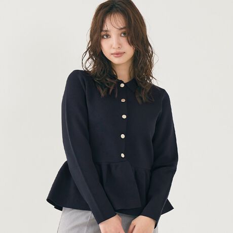 上品にまとまる、金ボタンフレアニットトップス
