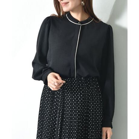 落ち感のあるポーラ素材を使用したライン配色デザインのブラウス。首周りはコンパクトですっきり、袖はボリュームのあるタックスリーブが着こなしのアクセントになります。襟周りとフロントは縦のラインを強調してくれるパイピングを施し、上品で小さなゴールドピンボタンが◎