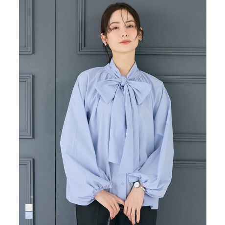 顔まわりを華やかに彩るボウタイが印象的な、上品ブラウス