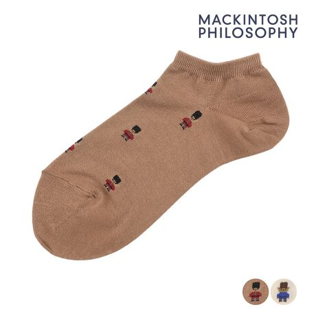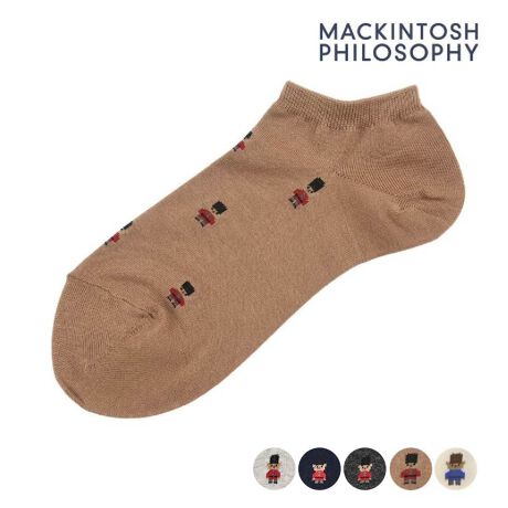 英国を代表する老舗ブランド、マッキントッシュ。そのセカンドラインとして誕生したマッキントッシュフィロソフィー。ロンドンのシンボル、バッキンガム宮殿を衛る熊の衛兵、バッキンガムベアを総柄にしたスニーカー丈ソックス。アイコニックなバッキンガムベアがキュートでプレゼントにもおすすめです!