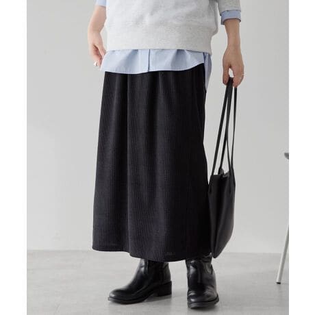 柔らかなカットコーデュロイ生地で仕立てたスカート。細畝の真っ直ぐなシルエットが縦ラインを演出し、レッグラインを拾いすぎずすっきり華奢見えを叶えます。ウエストはゴム仕様で楽に着脱でき、リラクシーな穿き心地なのも魅力的。どんなトップスとも合わせやすく、デイリーに活躍するおすすめのアイテムです。透け感[なし]