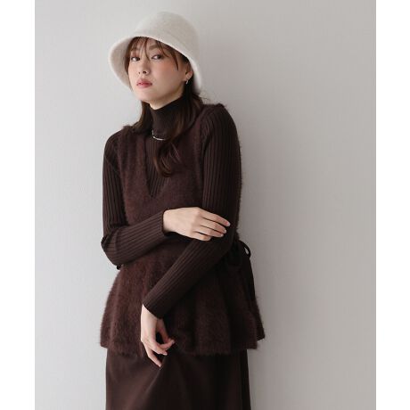 シャギーペプラムベストとワンピースがセットになったリブニットワンピース。