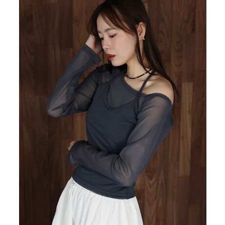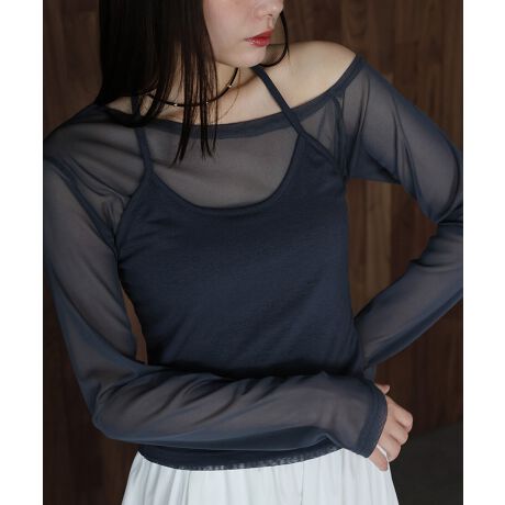 チュールインナーにホルターネックキャミソールをレイヤードしたようなデザインがこなれた印象を与えてくれます。
