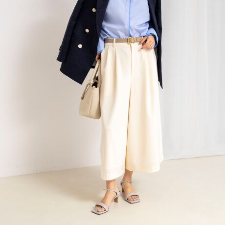 ・上品なウールのような微光沢感があるポリエステルのストレッチツイルを使用したトレンドのクロップドワイドパンツ