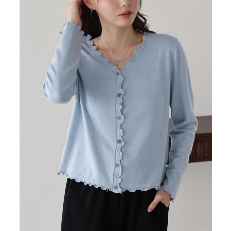 ネックラインから前立て、裾、袖口に施されたメローフリルが目を惹く大人可愛いカーディガン。