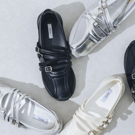 華奢なクロスベルトが春夏のコーディネートに抜け感を出してくれるメリージェーンスニーカー!サイド部分にメッシュ素材を使用し、夏でも通気性良く快適に履けるよう仕上げました。ベルトは3段階お好みのサイズ感に調節可能で、根本部分に伸縮性のあるゴム素材を施しベルトを外さなくてもスッと着脱出来て手間要らず◎約2cmの程よい厚みのソールは普段使いしやすく、つま先から踵までふわふわの中敷き入りでどこまでも歩いて行けそうな履き心地です。