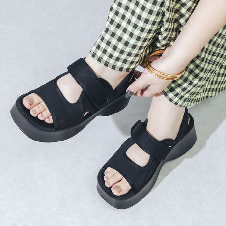 柔らかなフィット感と軽い履き心地が魅力の厚底サンダル!洗練されたスクエアトゥと柔らかなアッパーを合わせ、大人カジュアルな雰囲気にもハマるよう仕上げました。ベルクロ仕様のベルトでしっかりホールドしながら、軽量厚底ソールで驚きの歩きやすさ◎クッション性のある中敷き入りで、長時間の着用でも足裏が疲れにくく楽ちんなのも魅力の1つです。約7cmの厚底ソールでスタイルアップが叶い、普段使いはもちろんテーマパークやフェスにもおすすめ!