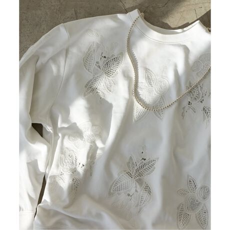 TOLIGHTデザイナー青山氏のドローイングをケミカルレースに起こし、スウェットにはめ込んだプルオーバー。