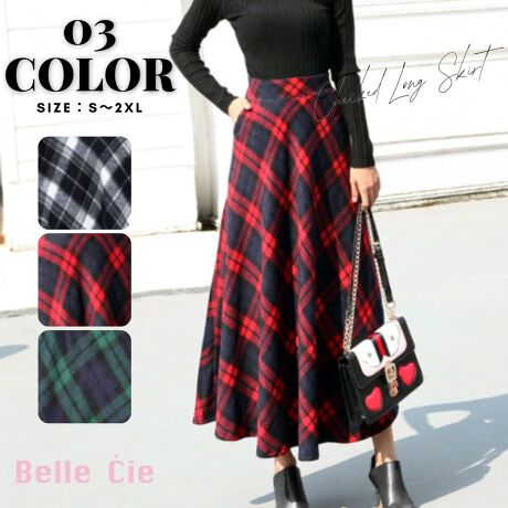 【チェック柄フレアロングスカート】