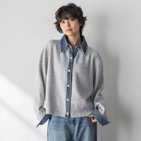 カーディガンにデニムシャツをレイヤードしたような、ドッキングデザイン。