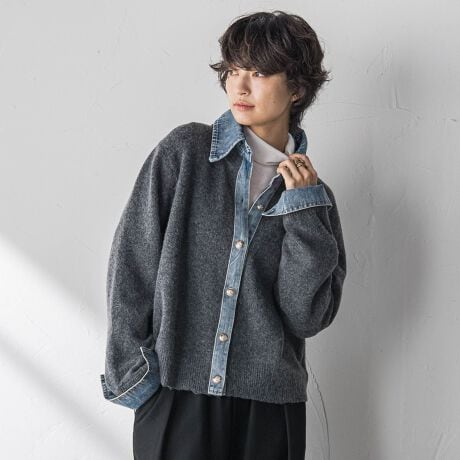 カーディガンにデニムシャツをレイヤードしたような、ドッキングデザイン。