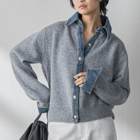 カーディガンにデニムシャツをレイヤードしたような、ドッキングデザイン。