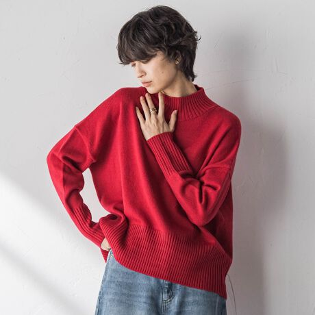 ハイネック×前上がりのカーブヘム、太めの裾リブが腰位置を高く見せる、美バランスニット。
