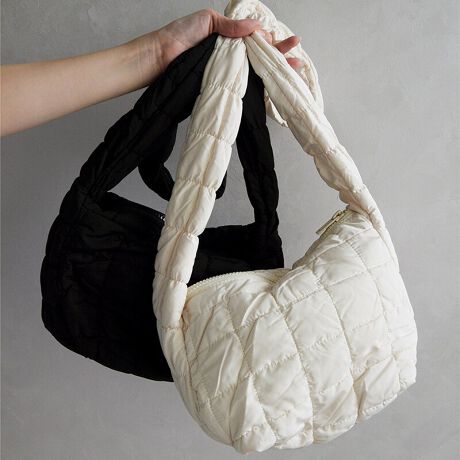 キルティングデザインが目を引くショルダーバッグは、ふっくらとした質感でカジュアルな中に女性らしい雰囲気をプラス。