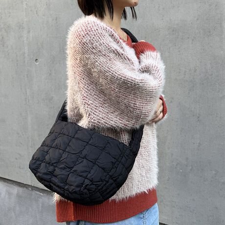キルティングデザインが目を引くショルダーバッグは、ふっくらとした質感でカジュアルな中に女性らしい雰囲気をプラス。