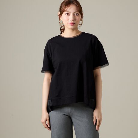 ベースは柔らかな肌触りのカットソー素材。チュールの透け感が視覚的にも涼やかで、汗ばむ季節もさらりと快適に、かつ華やかに装っていただけます。