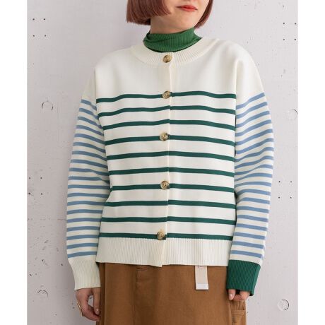 色とピッチの異なるボーダーを組み合わせた遊び心のあるカーディガン。前身頃は上側が無地のパネルボーダーにしています。カーディガンとしてはもちろん、ボタンをとめたままプルオーバーとしても着られます。前後両面で着用可能です。ポリエステル糸を使用して程よくハリを持たせ、シルエットが綺麗に出るのもポイントです。