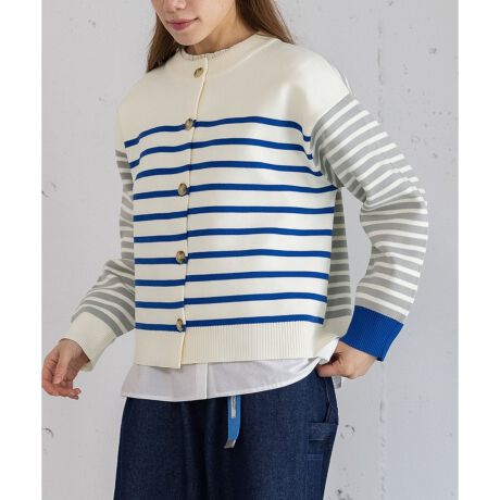 色とピッチの異なるボーダーを組み合わせた遊び心のあるカーディガン。前身頃は上側が無地のパネルボーダーにしています。カーディガンとしてはもちろん、ボタンをとめたままプルオーバーとしても着られます。前後両面で着用可能です。ポリエステル糸を使用して程よくハリを持たせ、シルエットが綺麗に出るのもポイントです。