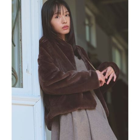 滑らかな毛足のフェイクファーが優雅な雰囲気を醸し出すノーカラーデザインのファージャケット。