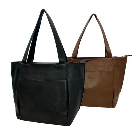 [型番:R-2603]シンプルで上品なPU素材のトートバッグ、前後面の持ち手ベルトの部分にタックをとっているので少し丸みを帯びた優しいイメージ、A4ファイルも問題なく入ります。前面外側には大きめのポケットがありとても便利、天にはファスナーも付いているので安心、裏地なしでオープンの内ポケットがついています。無駄な装飾を省いたミニマルなバッグです。上部40cm、底27x12、高さ30cm 重さ600g
