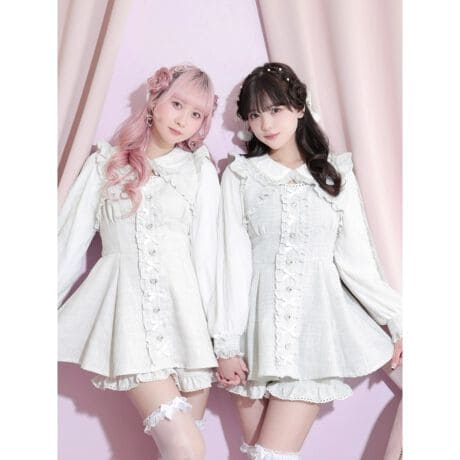 大きめ襟とフリルディテールが愛らしく、袖のレース切り替えがほどよい甘さを添えてくれます。
