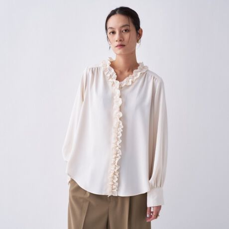 ・ボタンを隠した比翼仕立てのデザインがフリルの存在感を際立たせるデザイン。