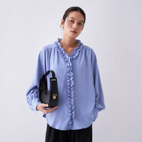 ・ボタンを隠した比翼仕立てのデザインがフリルの存在感を際立たせるデザイン。