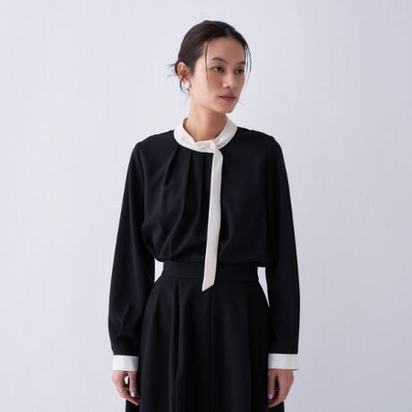 ・シックな配色デザインがアクセントになった、大人に似合うボウタイブラウス。